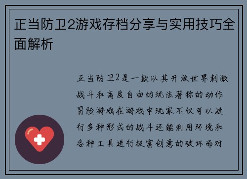 《孤岛惊魂2》是一款深受玩家喜爱的开放世界射击游戏,凭借其丰富的剧情、自由度极高的探索元素和令人振奋的战斗系统吸引了大量粉丝。在游戏中,玩家不仅要完成主线任务,还需要解锁各种隐藏任务和成就,这些都大大提升了游戏的可玩性和挑战性。为了帮助玩家更好地体验游戏,本文将针对《孤岛惊魂2》的存档分享与攻略进行...