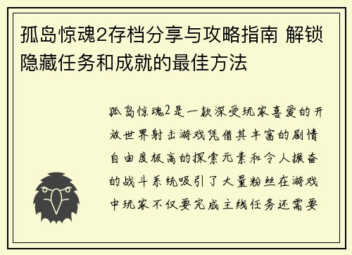 孤岛惊魂2存档分享与攻略指南 解锁隐藏任务和成就的最佳方法